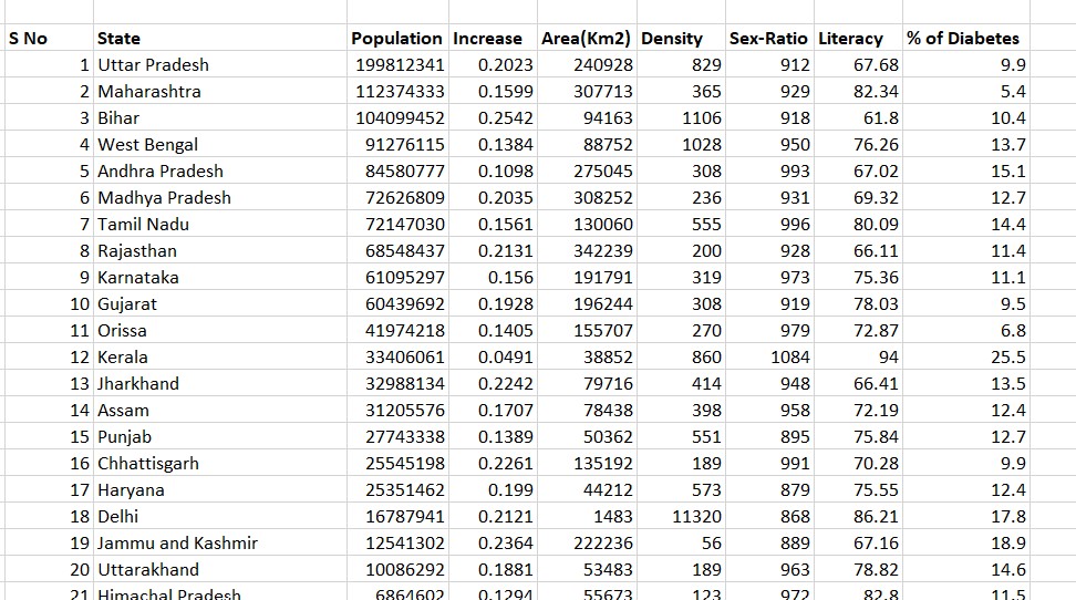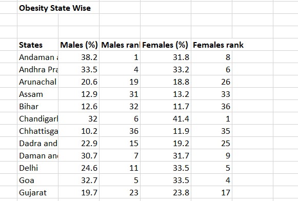 The Excel Sheet consists of Percentage-wise Obesity and Diabetes Chronic Disease